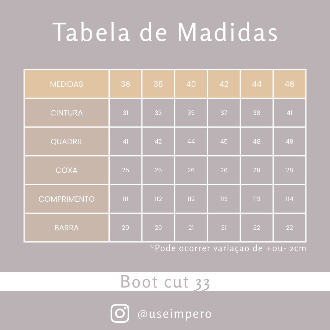 - Modelagem Botcut: Ajustada e confortável, com barra mais larga, ideal para ser usada com botas, valorizando seu estilo com um toque clássico e sofisticado.